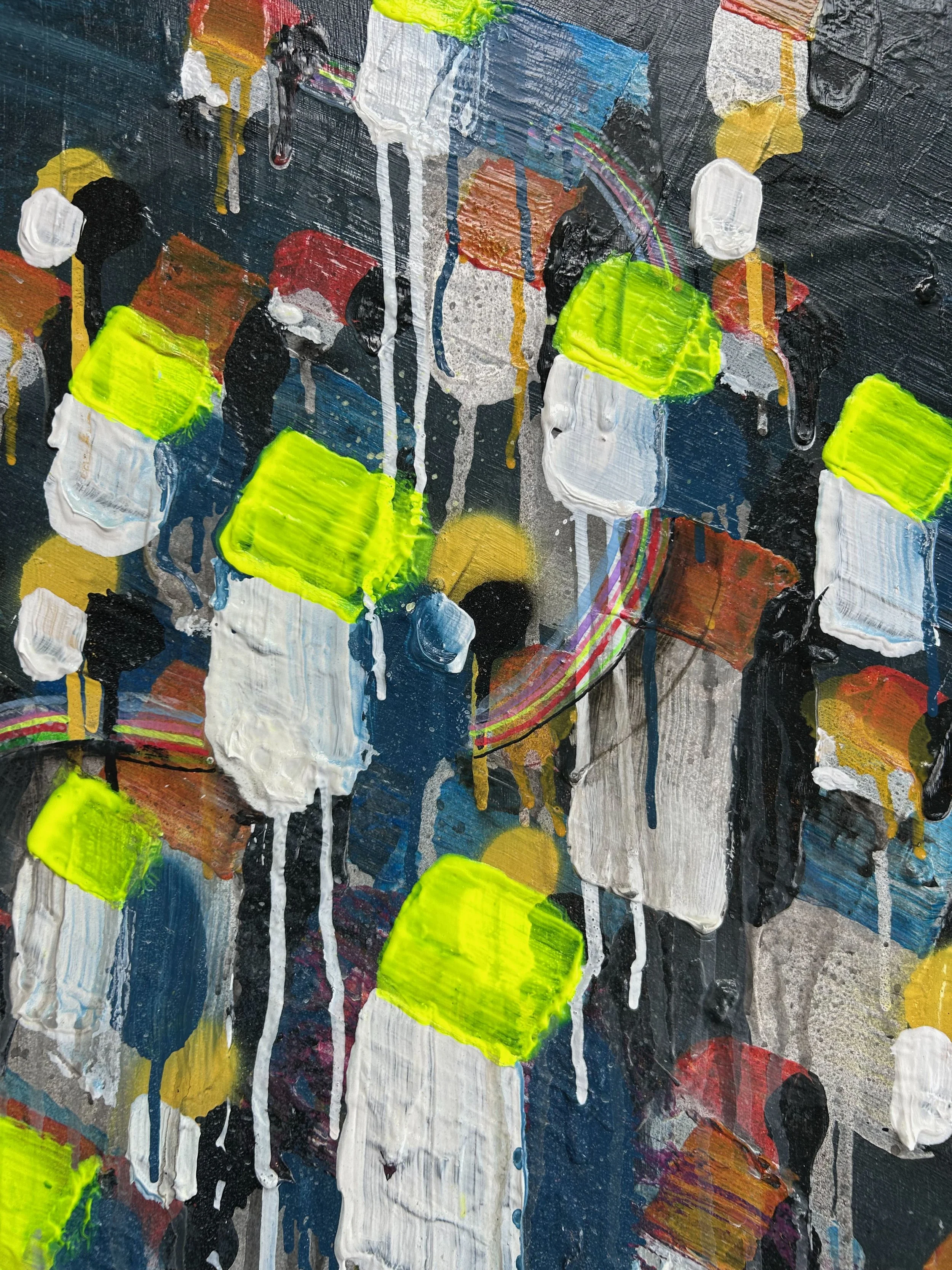 Mixed media (Tape, Acrylic, Spray Paint, Oil pastel, Pencil) on board.