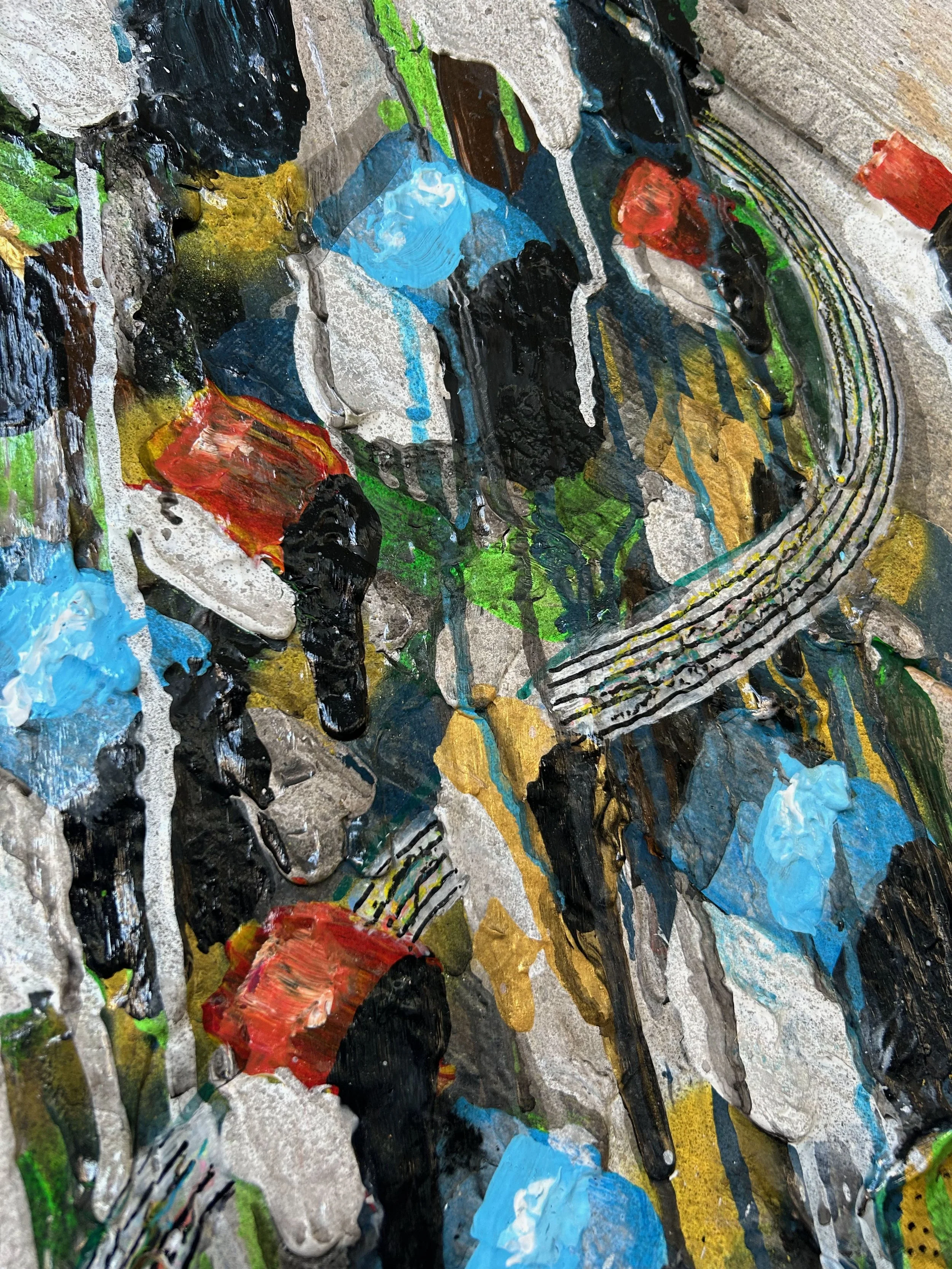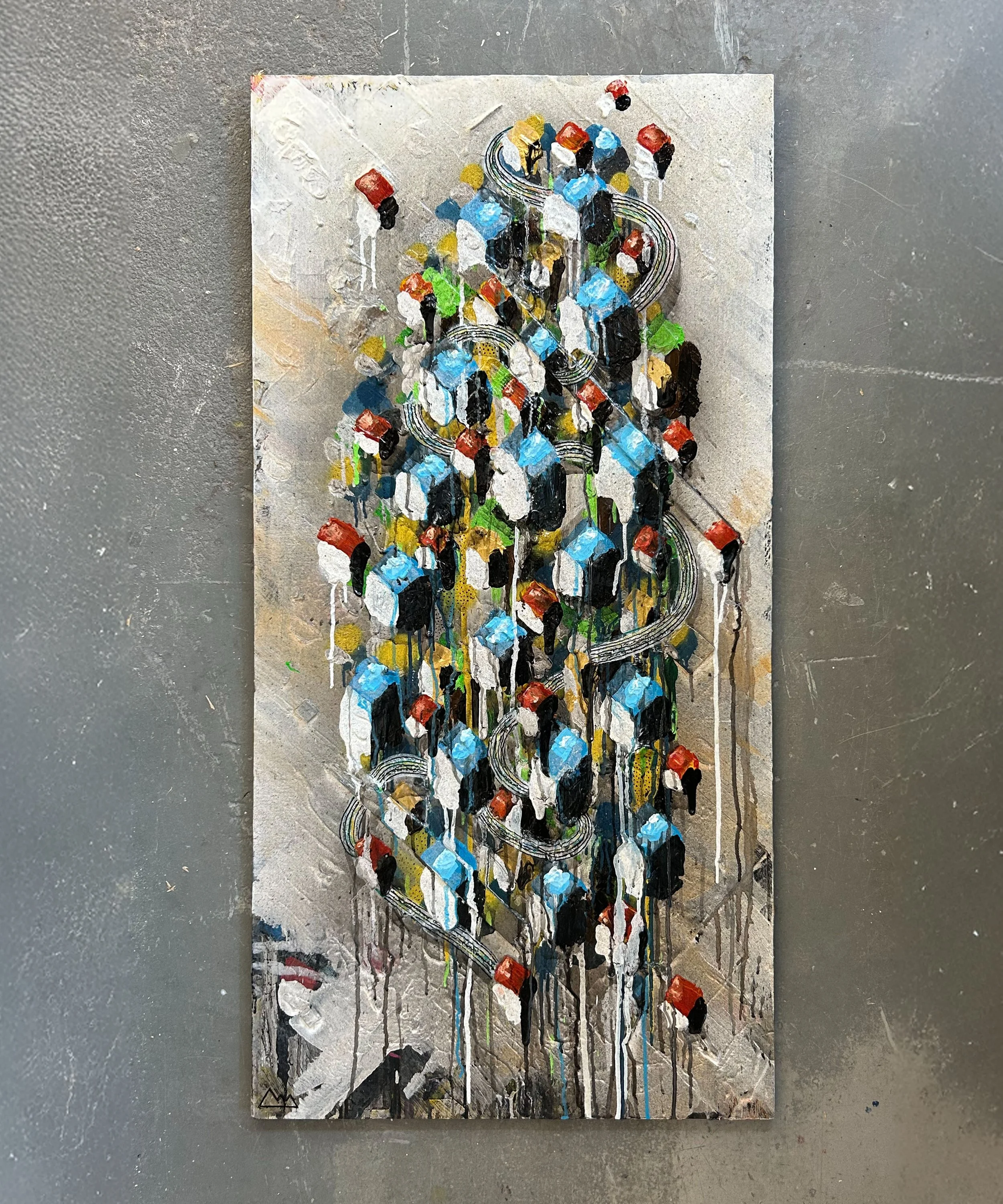Mixed media on wood panel (Tape, Acrylic, Spray Paint, Oil pastel, Pencil).
